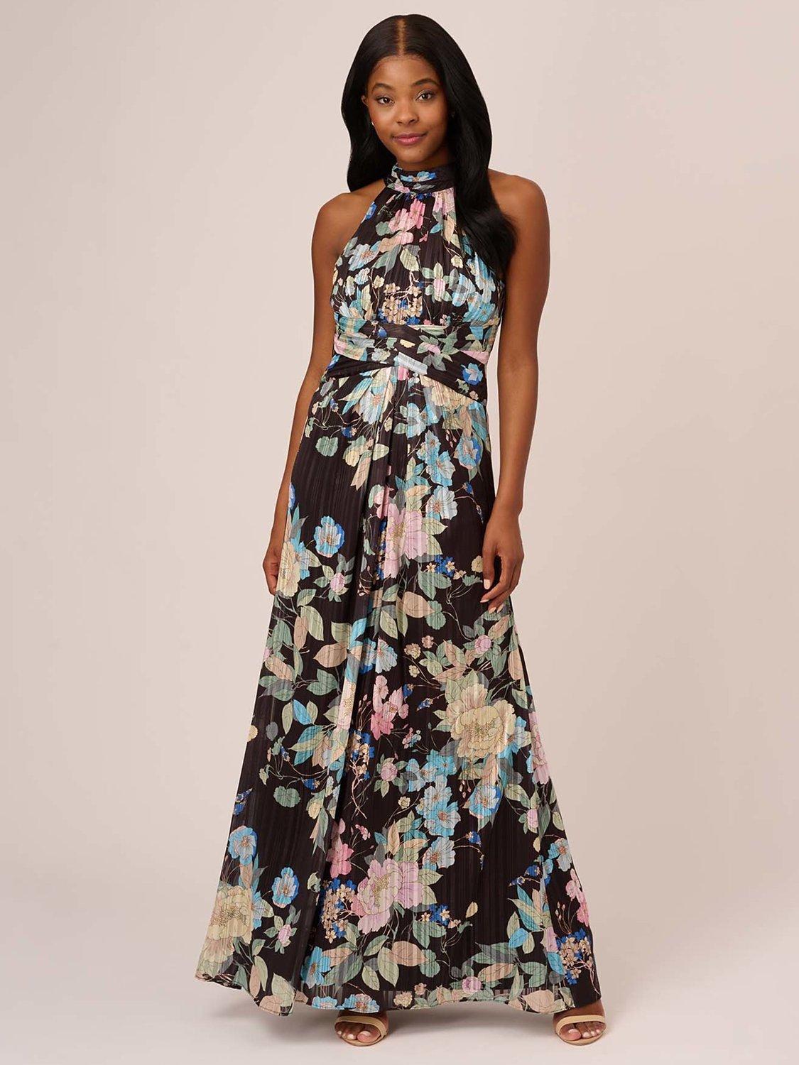 Adrianna Papell Floral Chiffon Halter Neck Maxi Dress Black Multi Very well made.