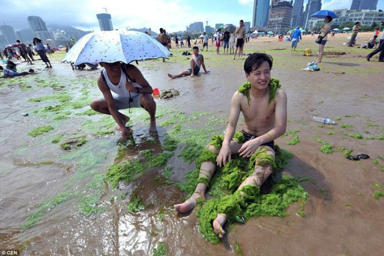 Bizarre trend sees Chinese beach goers using green algae Very well made.