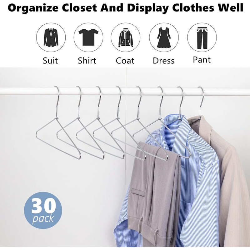 Rebrilliant Heavy Duty Metal Shirt Coat Hangers 30 Pack Stainless Steel Clothes Hanger With Polished Chrome 17 Inch Silver Metal Wire Hanger Wayfair Very well made.