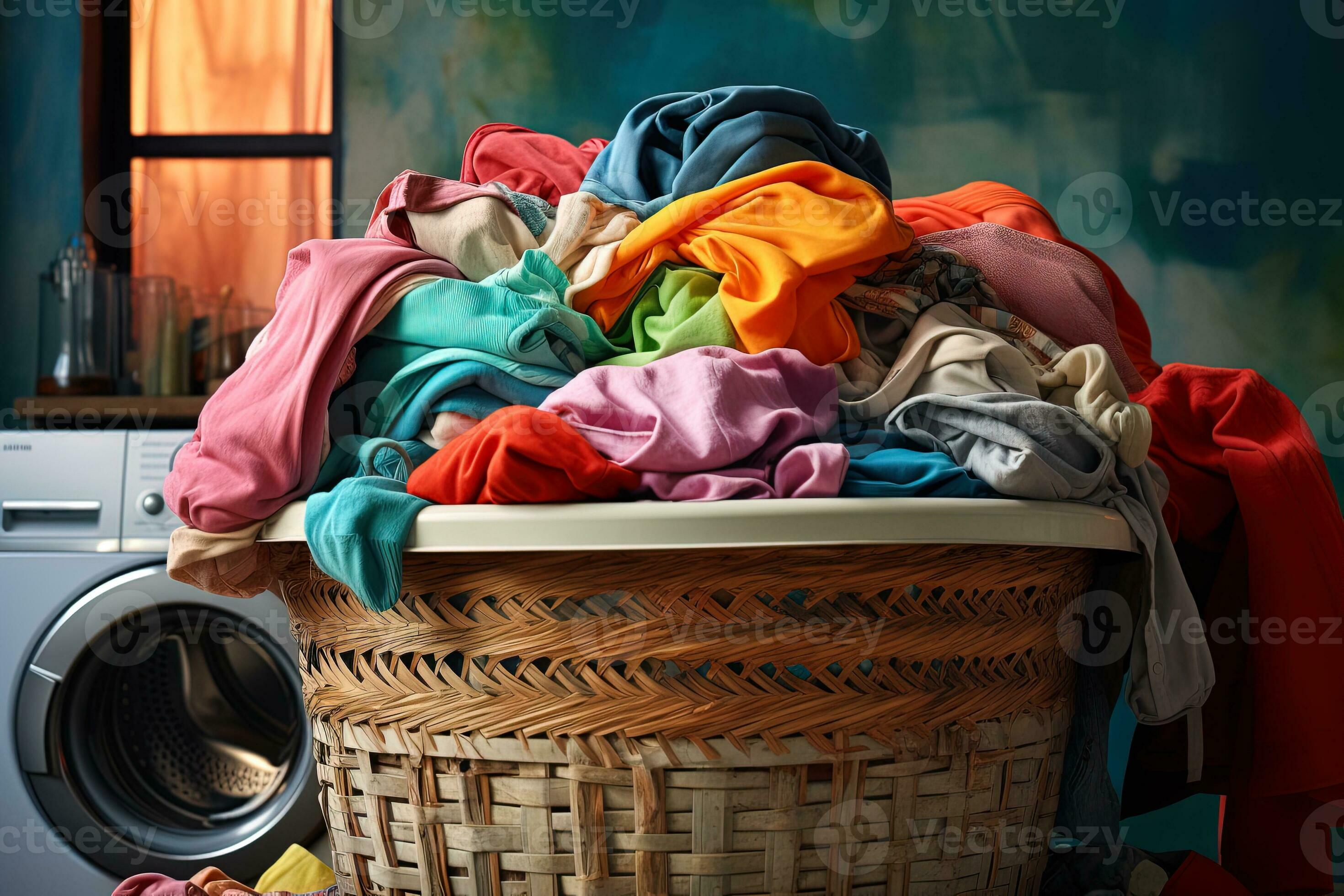A pile of colored clothes in a laundry basket ready to be washed with a washing machine in the background 29784684 Stock Photo at Vecteezy Very well made.
