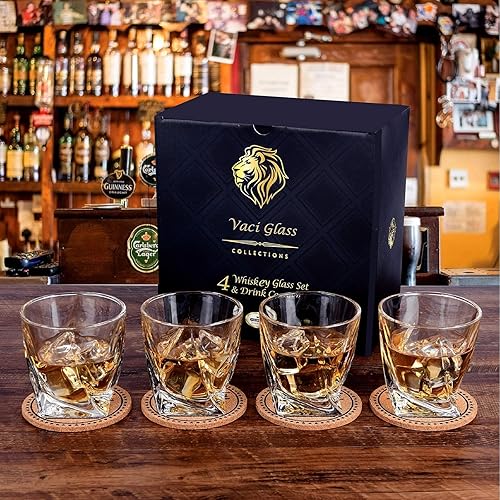 VACI GLASS Crystal Whiskey Glasses Set of 4 with 4 Drink Coasters Crystal Scotch Glass Malt or Bourbon Glassware Set in Oman Whizz Old Fashioned Glasses Very well made.