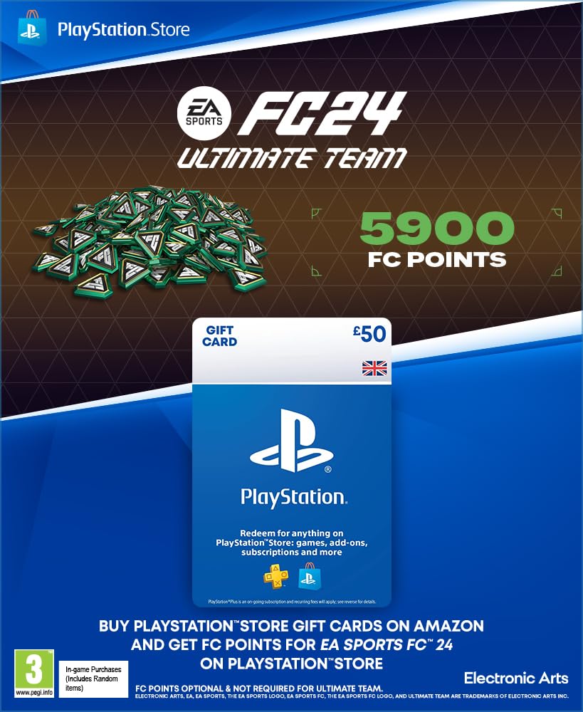 50 PlayStation Store Gift Card for EA SPORTS FC 24 Ultimate Team 5900 FC Points UK PSN Account Amazon PC Video Games Very well made.