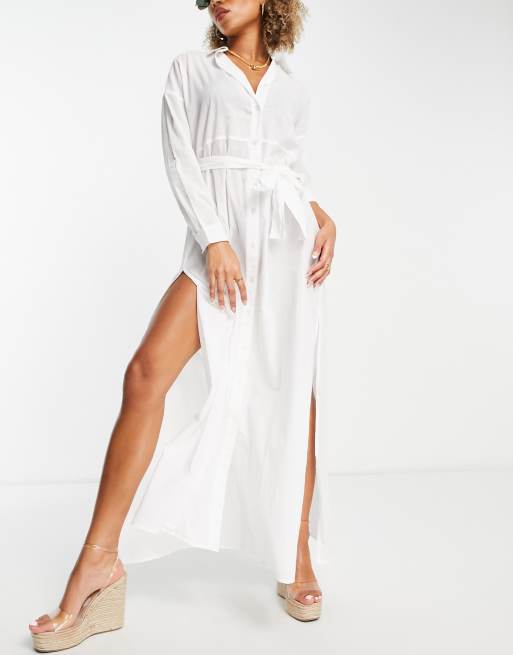 Vestido camisero playero largo beis transparente con lazada en la Very well made.
