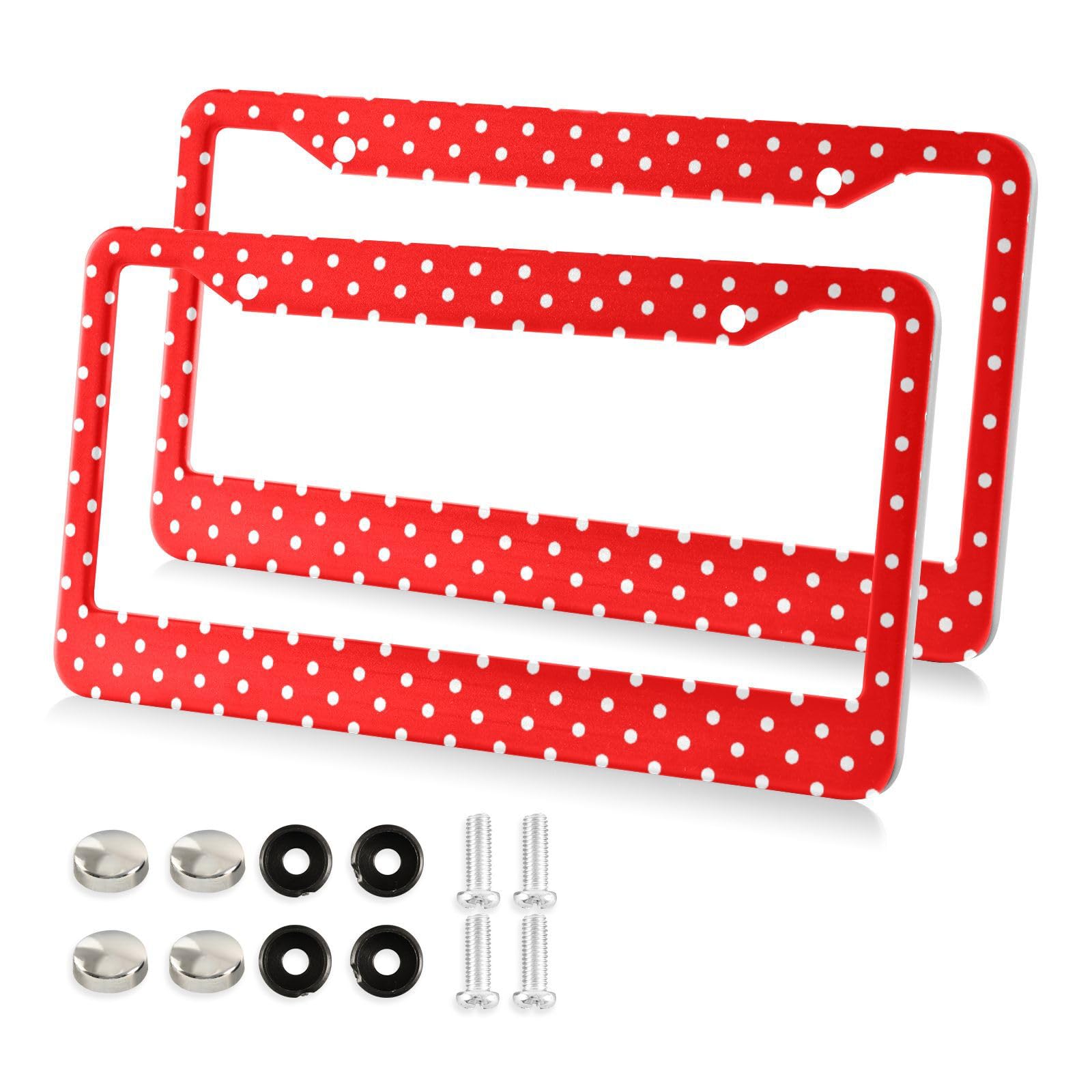 Amazon White Polka Dots License Plate Frame 2 Pack Universal Stainless Steel License Plate Holder with Screws Chrome Caps 2 Holes Car Very well made.