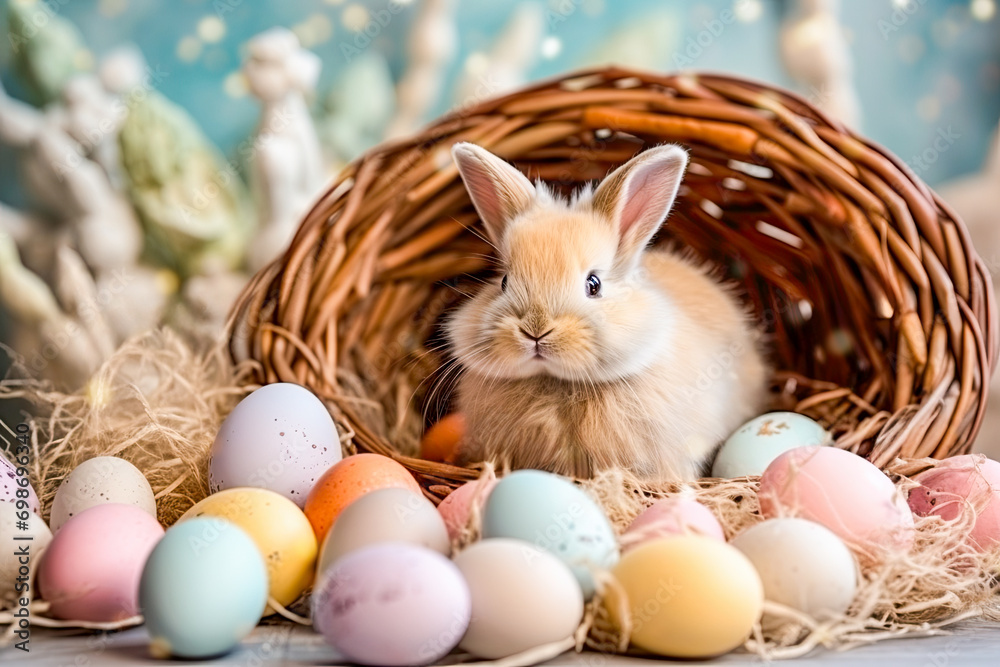 Photo Easter rabbit and colorful easter eggs on blurred background with bokeh maribom Posters tableaux et papiers peints Europosters Very well made.