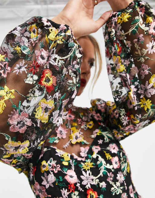 Vestido corto negro transparente con cuello de pico y adornos de flores de ASOS Luxe Very well made.