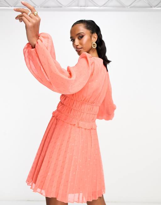 ASOS DESIGN Petite button through ruched waist pleated mini dress in metallic textured in coral Very well made.