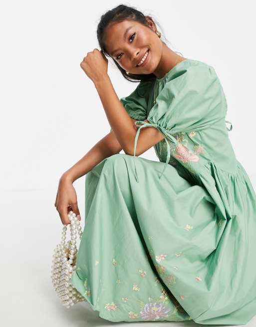 ASOS DESIGN Petite cotton poplin embroidered midi smock dress with open back in sage green Very well made.
