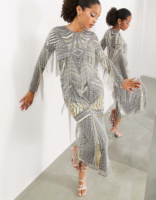 Vestido midi gris carb n ajustado con dise o adornado y flecos de cuentas de ASOS EDITION Very well made.