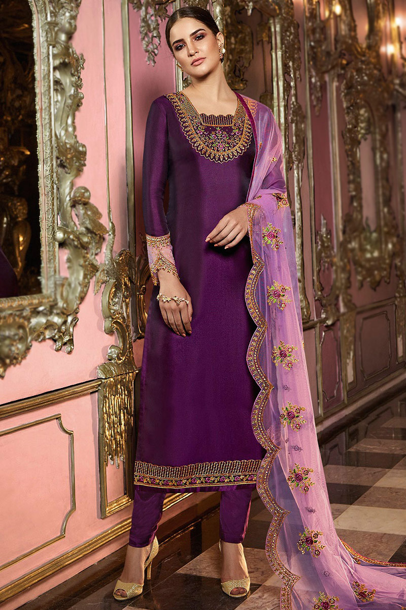 Georgette Stone Embroidered Purple Cigarette Pants Suit LSTV125925 Very well made.