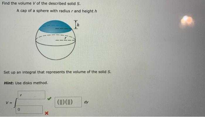 Find the volume V of the described solid S. A cap of a sphere with radius r and height h V Homework.Study Very well made.