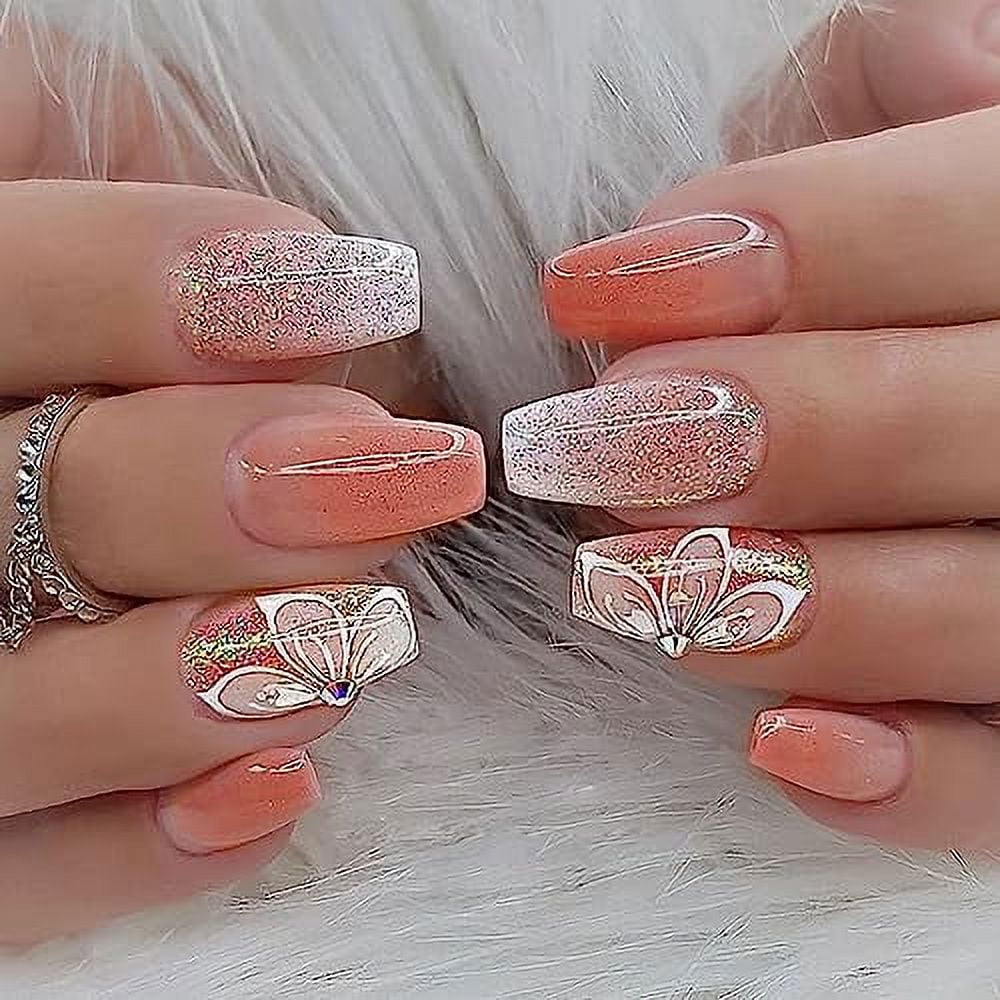 Pink Press on Nails Coffin Short Acrylic Nails Artificial False Nails with Glitter Butterfly Designs Full Cover Gradient Pink Fake Nails Short Ballerina Nails for Women Walmart Very well made.