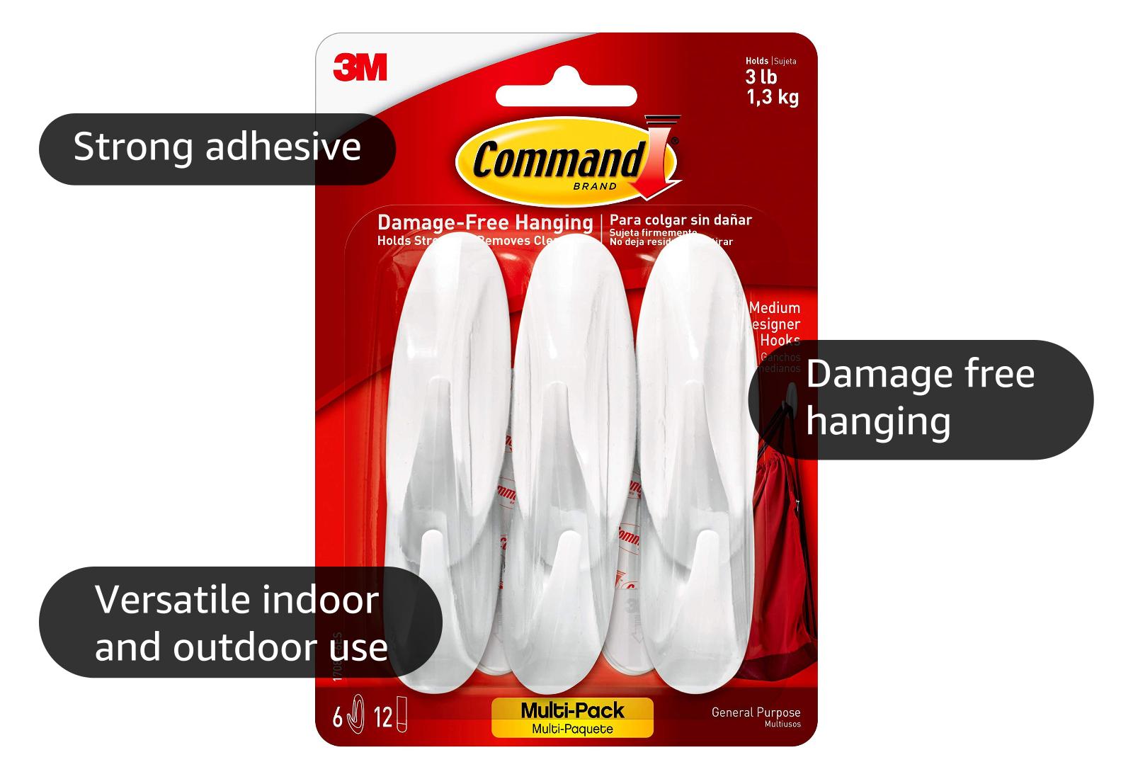 Amazon Command Medium Designer Hooks Holdes up to 3 lb 6 Wall Hooks with 12 Command Strips White Damage Free Hanging Hooks for Hanging Decorations in Living Spaces Home Kitchen Very well made.