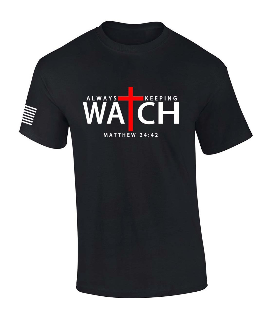 Mens Christian Shirt Always Keeping Watch Matthew 24 42 Scripture American Flag Sleeve T shirt Graphic Tee Very well made.