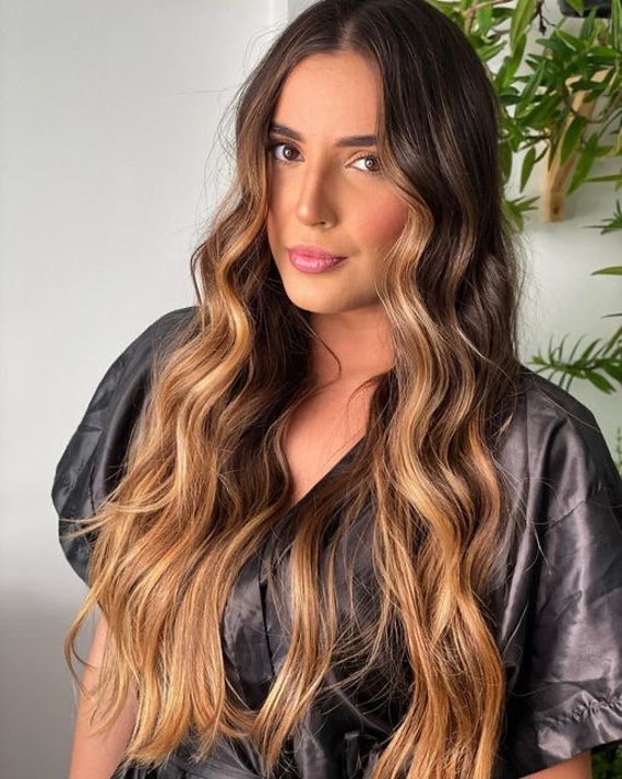 Long Middle Part Wavy Chestnut Brown with Honey Blonde Balayage Lace Front Wigs Sofiathewigstylist004 Very well made.