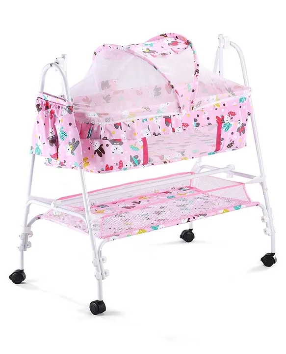 Firstcry Pondicherry Babyhug beautiful cradle made of wood can gently rock your baby to sleep. It has a locking pin which can be used to keep the cradle stationary. Casters are Very well made.