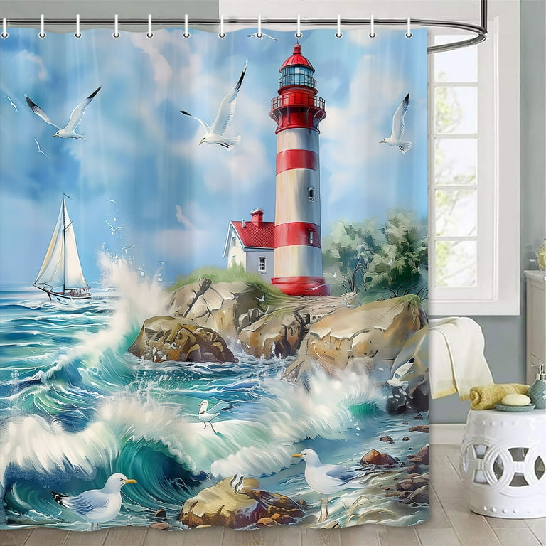 Lighthouse Shower Curtain Ocean Wave Beach Seagull Shower Curtain for Bathroom Decor Nautical Sailboat Blue Sky Lighthouse Cottage Bath Very well made.