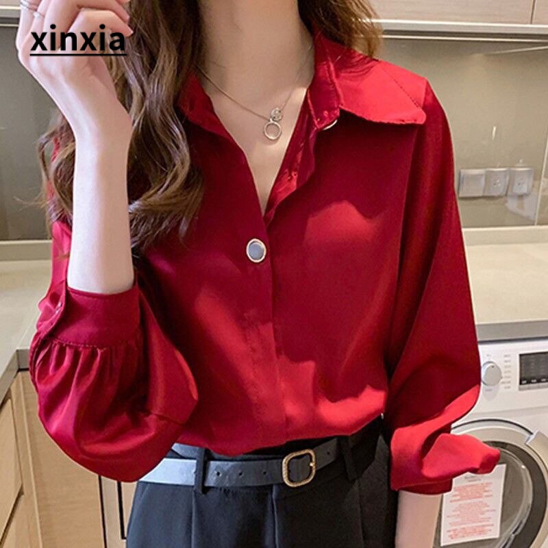 xin Blusa De Estilo Coreano Blanco Rojo Tops De Moda Camisas Sueltas Ropa De Seda Se oras Kpop Gasa Satinada Talla Grande Top De Mujer Very well made.