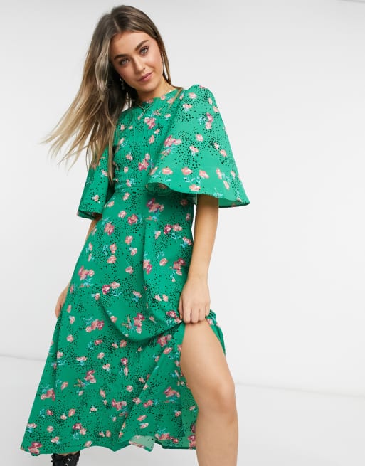 Vestido largo verde con estampado de flores jaretas y manga Very well made.