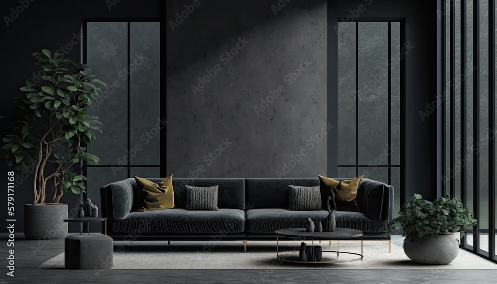 A modern luxury living room with a black sofa paired with a dark concrete wall that offers a sleek and contemporary vibe. generative ai Stock Illustration Adobe Stock Very well made.