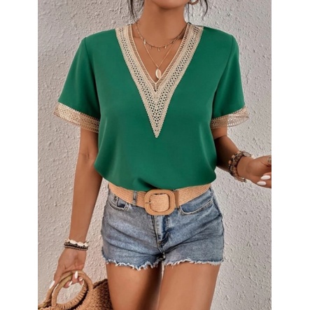 Damas Novo Estilo Costurando Renda Gola V Camisa Manga Curta Casual Larga Senhoras Ver o Elegante Combina Com Tudo Escrit rio Top 2 Very well made.