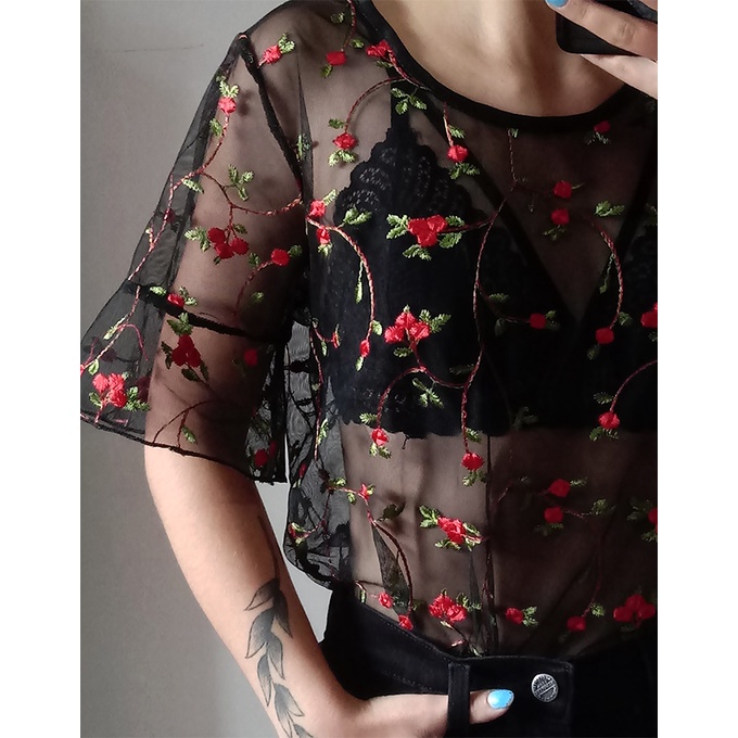 Blusa Tule Transparente Bordada Flores Kit 2 Pe as 760 Very well made.