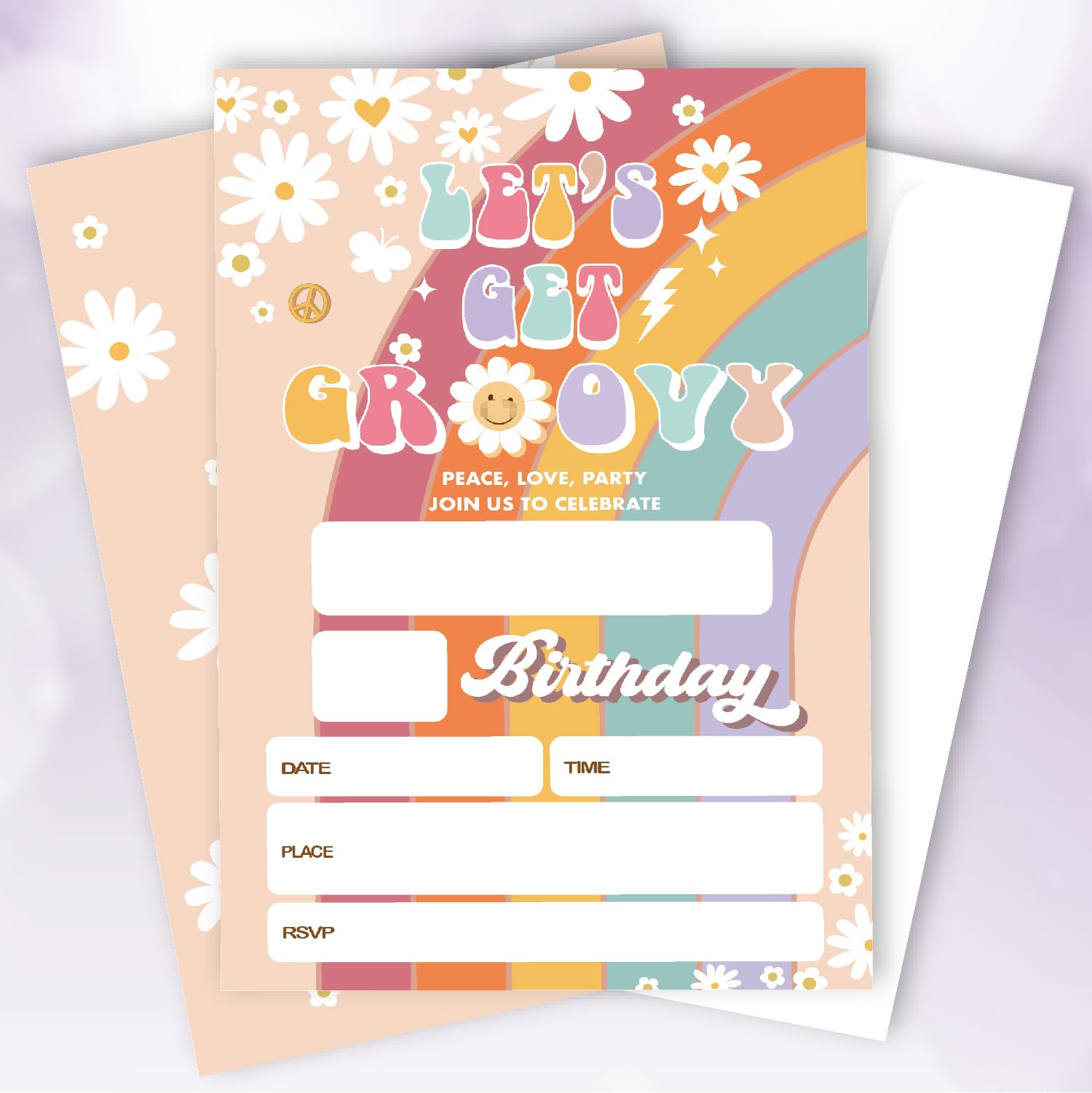 Amazon grapehiker 20 Sets Let s Get Groovy Birthday Party Invitations With Envelopes Retro 70s Face Hippie Double sided Printed Birthday Party Invite Cards Invitations for Teen Girls Kids Skate In... Very well made.