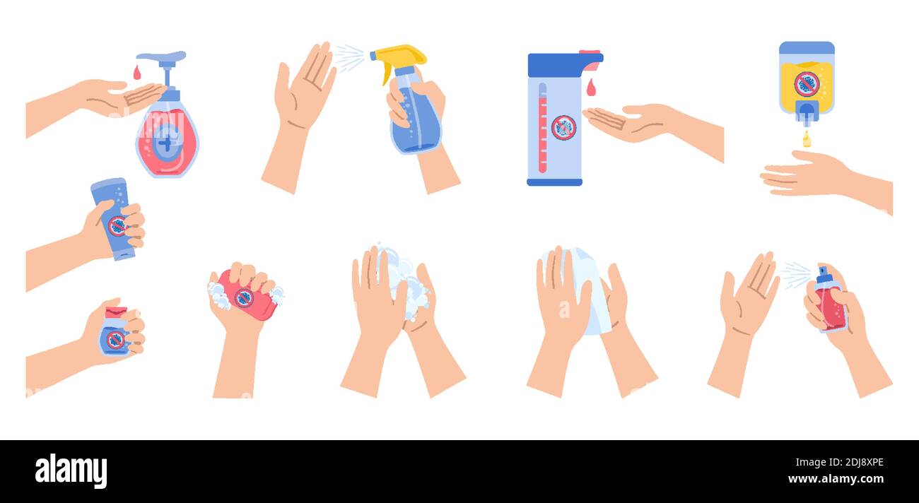 Coronavirus infographic hands use spray sanitizer wash soap against covid virus cartoon set. Coronavirus flat disinfection sanitizer bottles antiseptic gel collection. Isolated vector illustration Sto... Very well made.