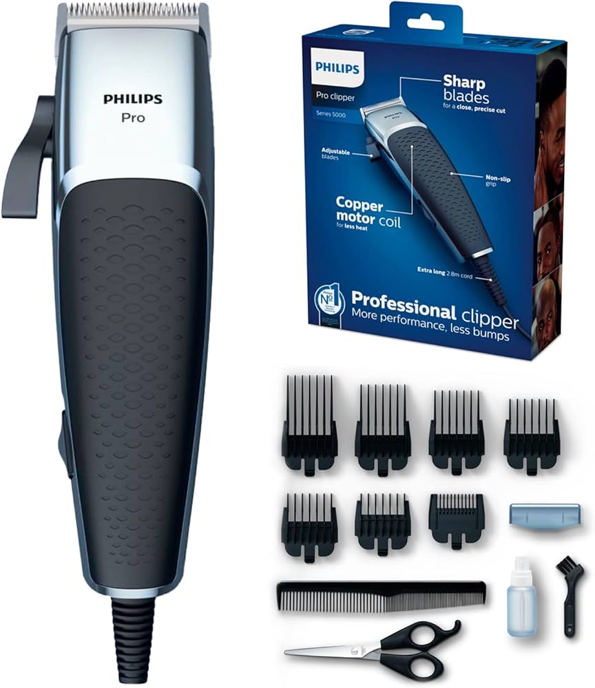 Philips Hair Clippers for Men Series 5000 Professional Hair Clipper and Beard Trimmer with Length Adjustable Blades Grades 0 4 Corded UK 3 Pin Plug HC5100 13 Black Silver Amazon Beauty Very well made.