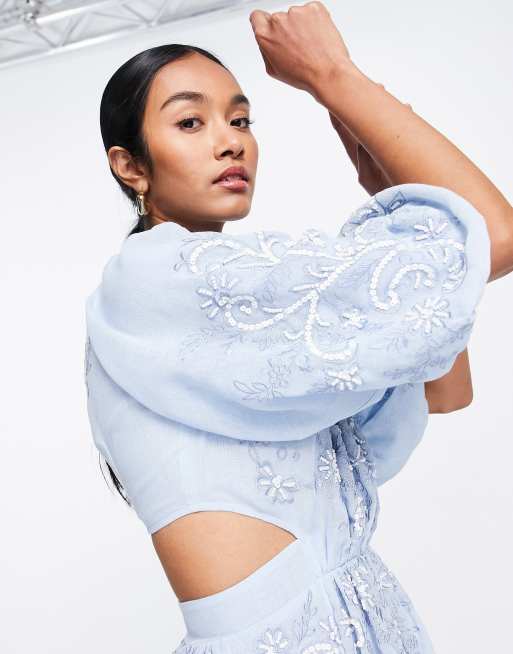 ASOS EDITION Midikleid in Blau mit Puffarmeln Cut Out am Rucken und Perlenstickerei Very well made.