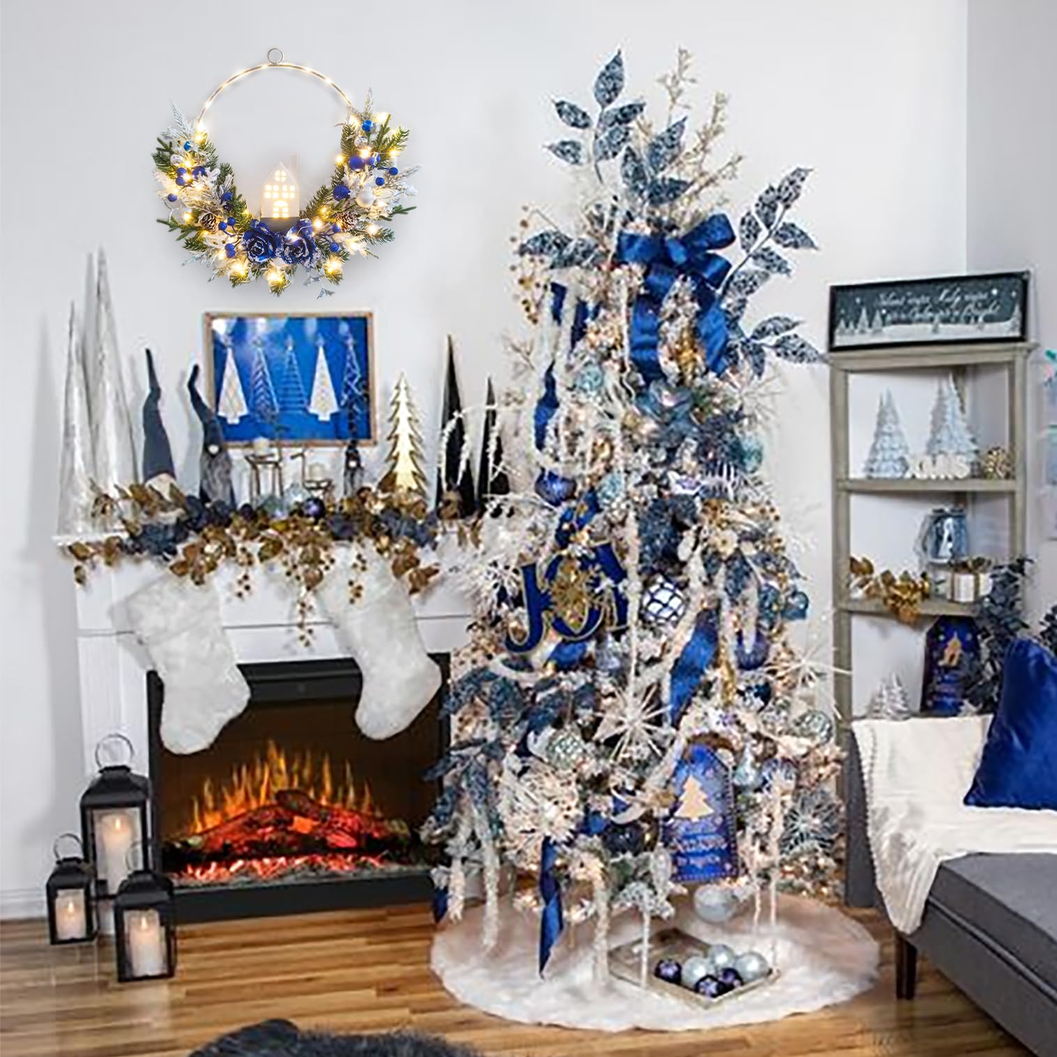Amazon prelit Blue Silver Christmas Hoop Wreath with Lighted House Farmhouse Lighted Winter Wreath 18inch Christmas Wreath for Front Door Winter Holiday Wreath Porch Decor Modern Mantel Decoration... Very well made.