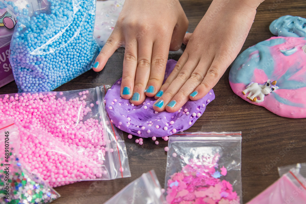 Poster Print Young kids playing with colorful slime kit with glitter toys texture craft bal 40x26.7 cm Very well made.