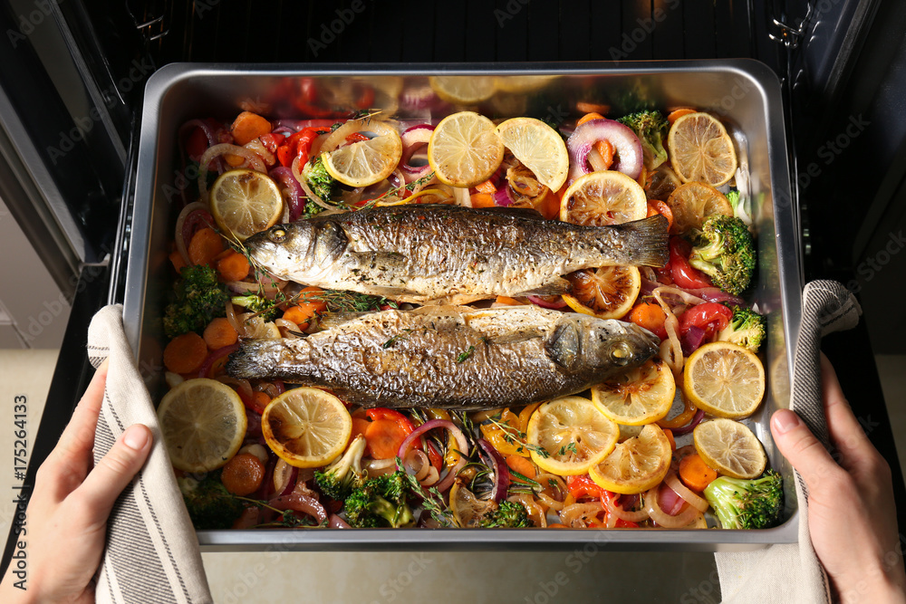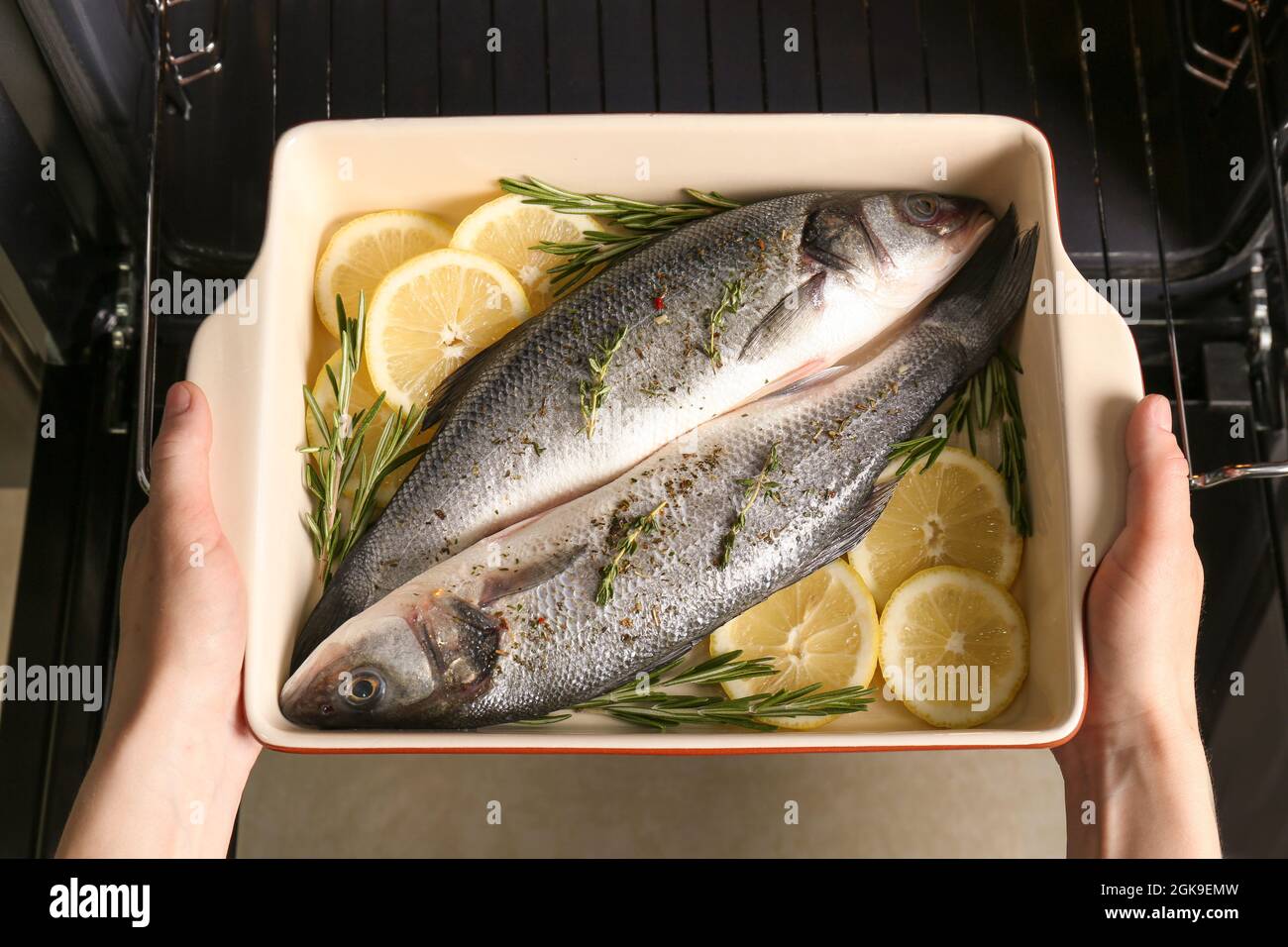 Woman putting baking tray with fish into oven Stock Photo Alamy Very well made.
