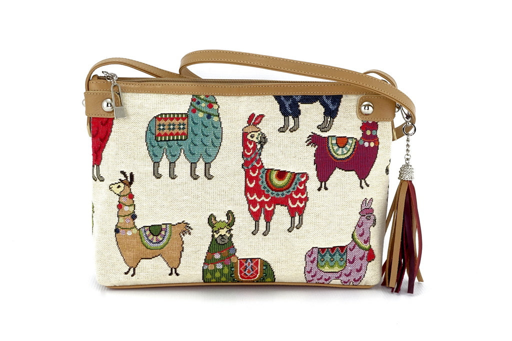 Tote Bag small Rosie Llama print fabric with beige leather trim Wild Harry Very well made.