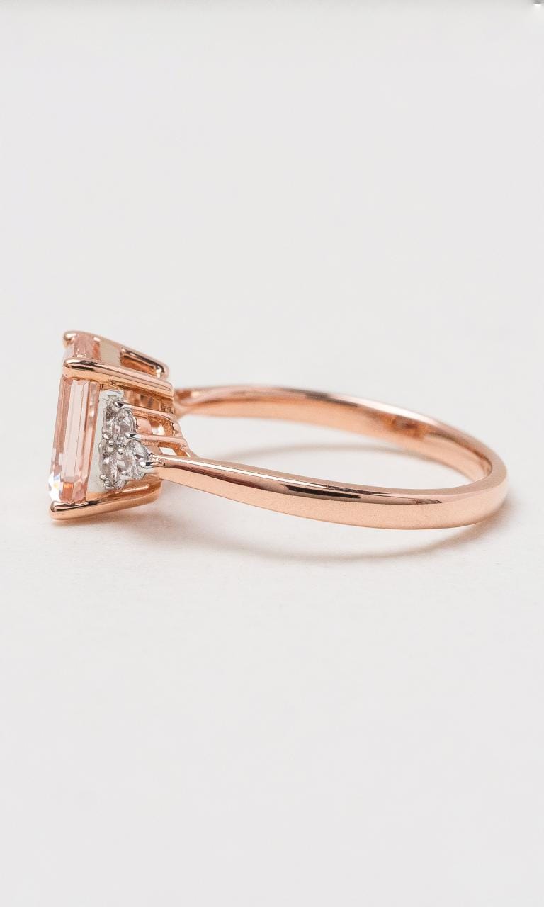9kt Rose Gold Emerald cut Morganite 1.37ct and Baugette Diamond ring Very well made.