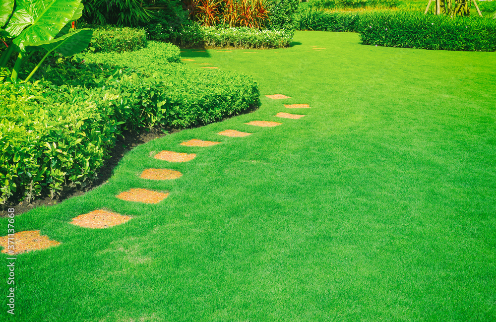 Landscape design Peaceful Garden Green garden and lawn Green lawn Garden in spring Pathways with green lawns Landscaping in the garden Curve walkway on the green grass field and flower. Stock Photo Very well made.