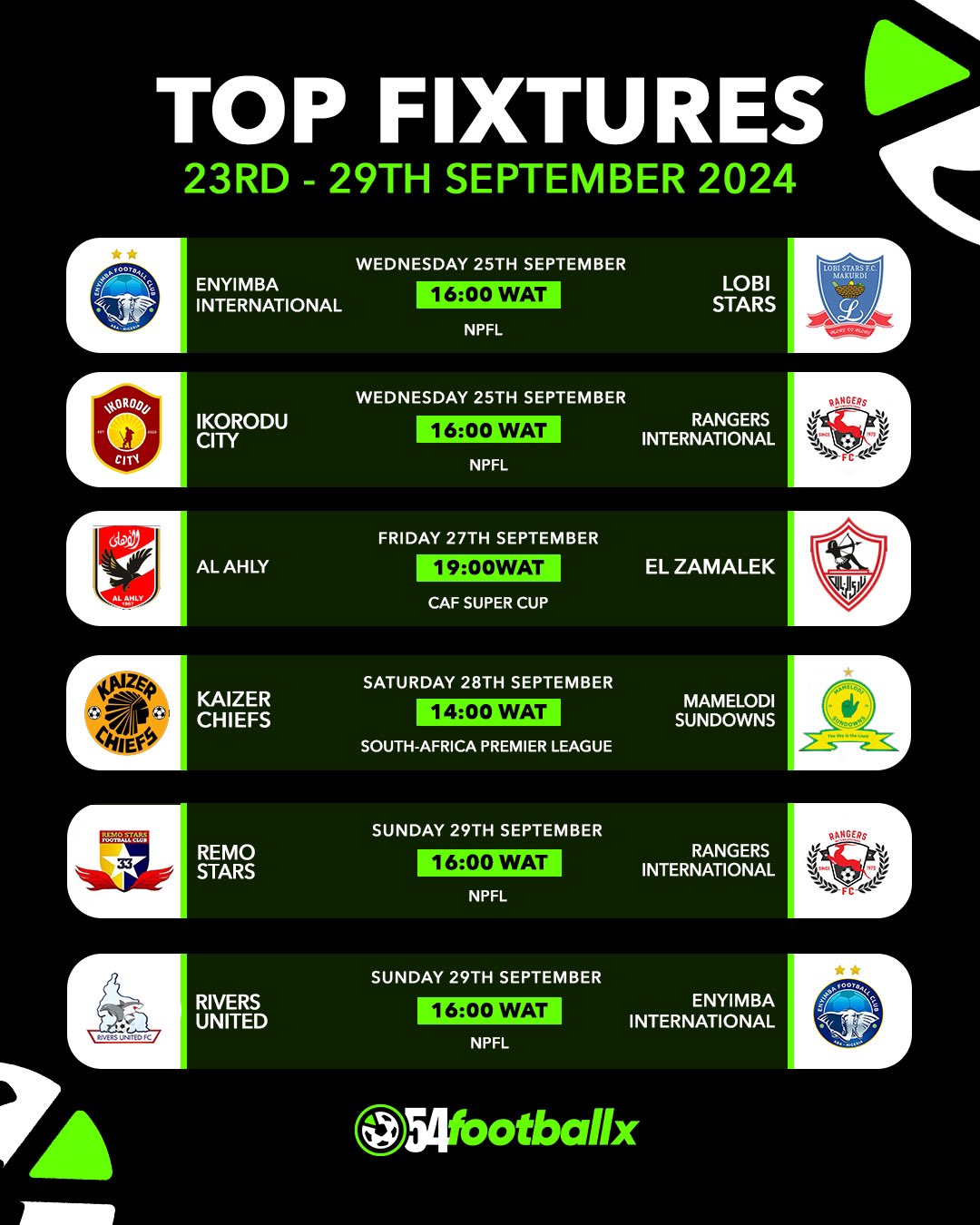 Official54fx on X TOP FIXTURES FOR THE WEEK This week our top fixtures sweeps across Africa. From the rescheduled NPFL25 MD2 fixtures to the CAF Super Cup the South African Premier Very well made.