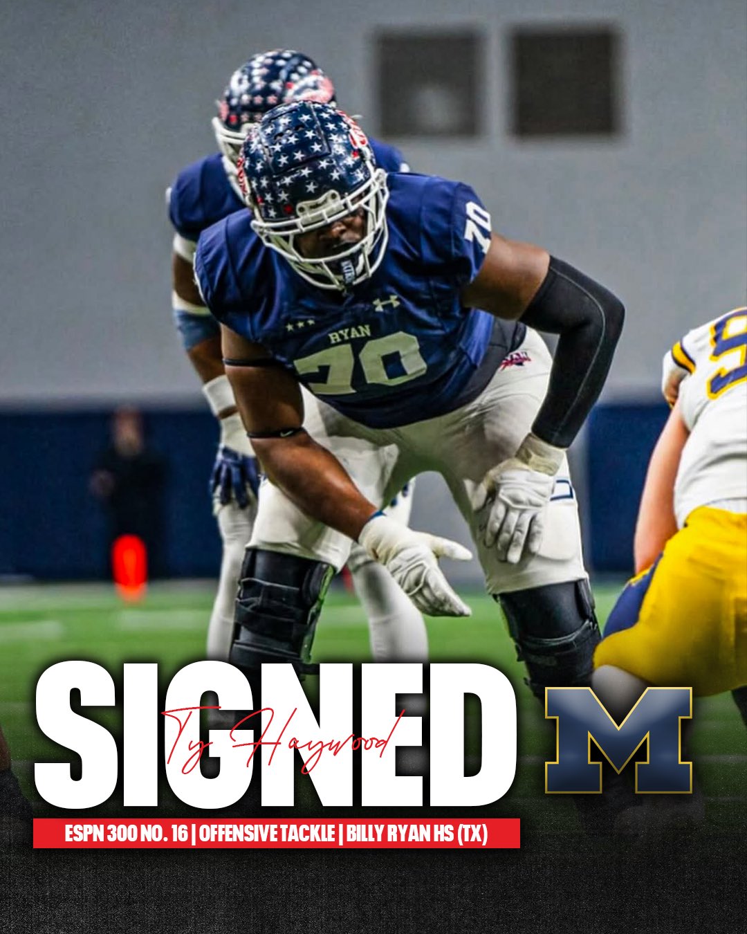 Billy Tucker on X Ty Haywood has officially signed with Michigan TyHaywood The 5 star offensive tackle was the top remaining prospect in the ESPN 300 and now gives the Wolverines an Very well made.