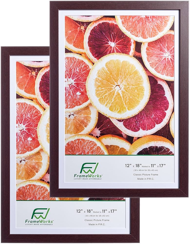 Amazon FrameWorks 2 Pack 12x18 Matted to 11x17 Picture Frame Mahogany Classic Wooden Photo Frame with Tempered Glass Modern Matte Finish for Prints Posters Certificates Wall Decor Gallery Ready Very well made.