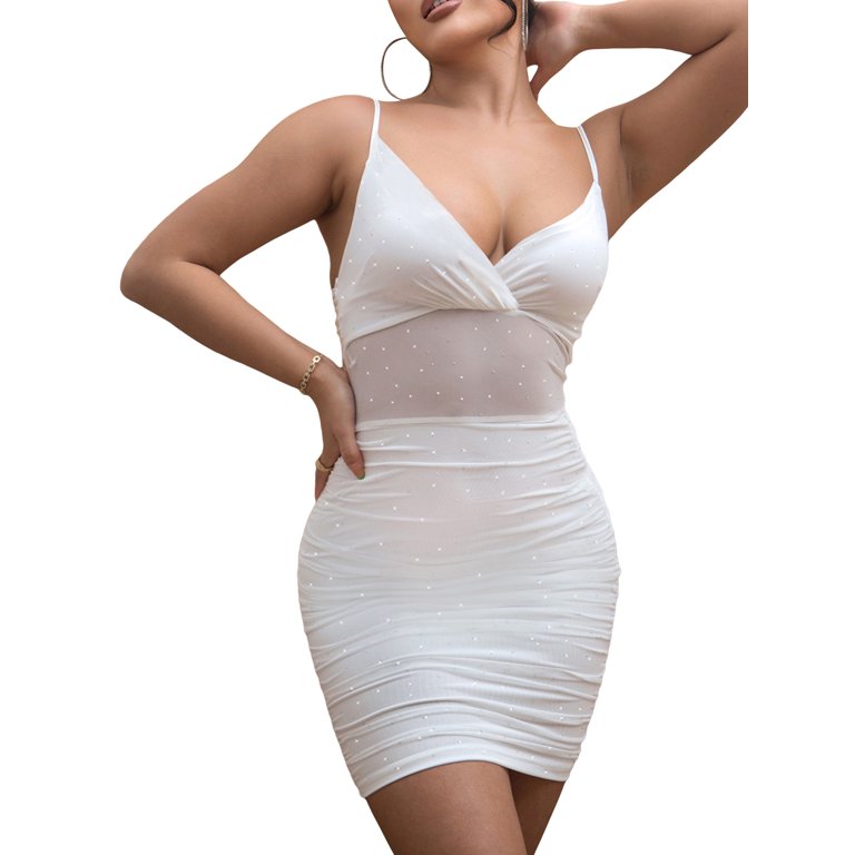 Women Fairy Aesthetic Bodycon Mini Dress Spaghetti Strap Low Cut Rhinestones Ruched Short Dress Summer Going Out Sundress White S Walmart Very well made.