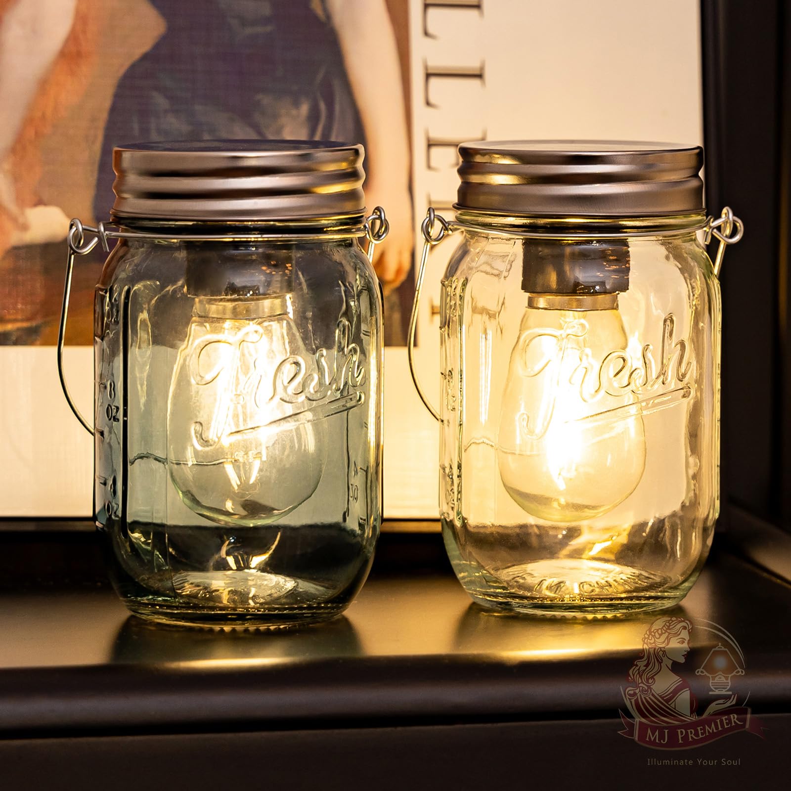 MJ PREMIER Mason Jar Lights 2 Pack LED Bulb Garden Lanterns Battery Operated Table Lamps Hanging Cordless Glass Lamps Outdoor Indoor for Very well made.