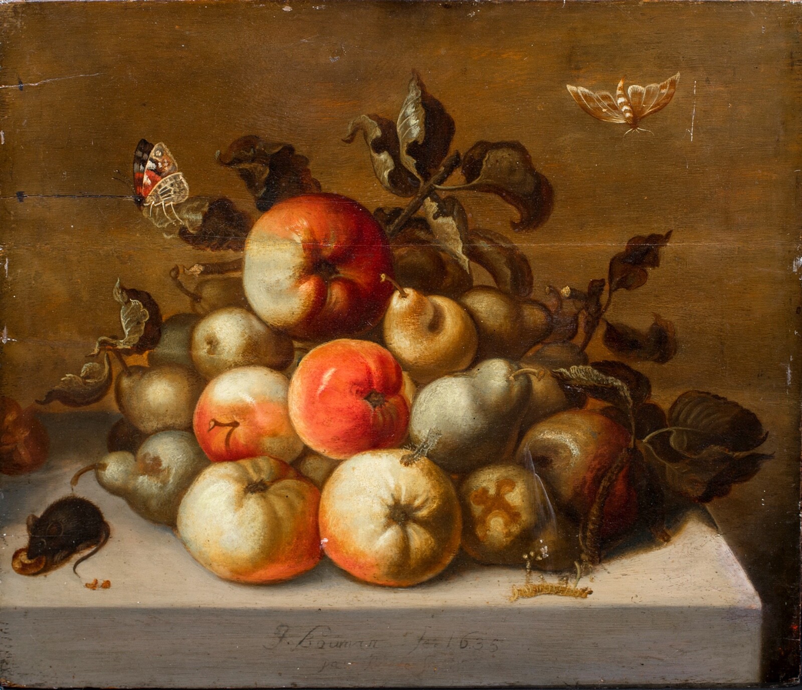 Large 17th Century Dutch Old Master Still Life Fruit Insects Mouse Butterflies Very well made.
