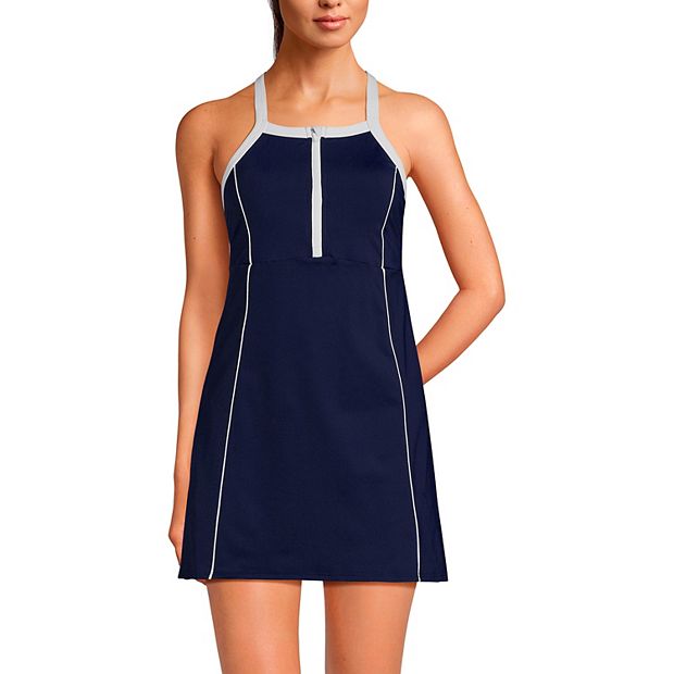 Women s Lands End High Neck Zip Front Slimming One Piece Swimsuit Dress Very well made.