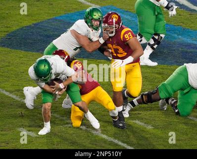 Oregon Ducks quarterback Tyler Shough 12 makes a move with the football against the USC Trojans during the 2020 Pac 12 Championship Game Friday Dec. 18 2020 in Los Angeles. The Ducks defeated Very well made.