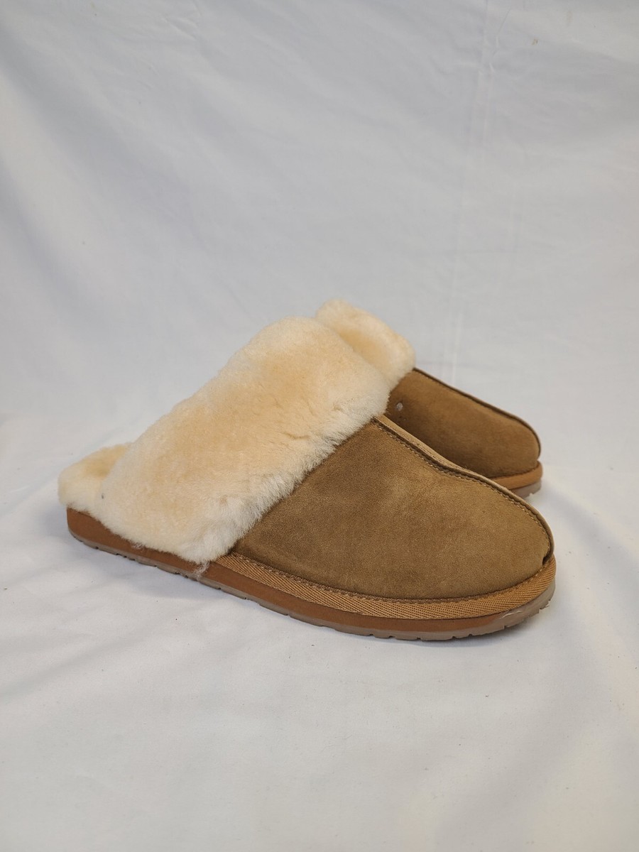 Lands End Suede Leather Shearling Fur Scuff Slippers English Tan Womens Size 9M Very well made.