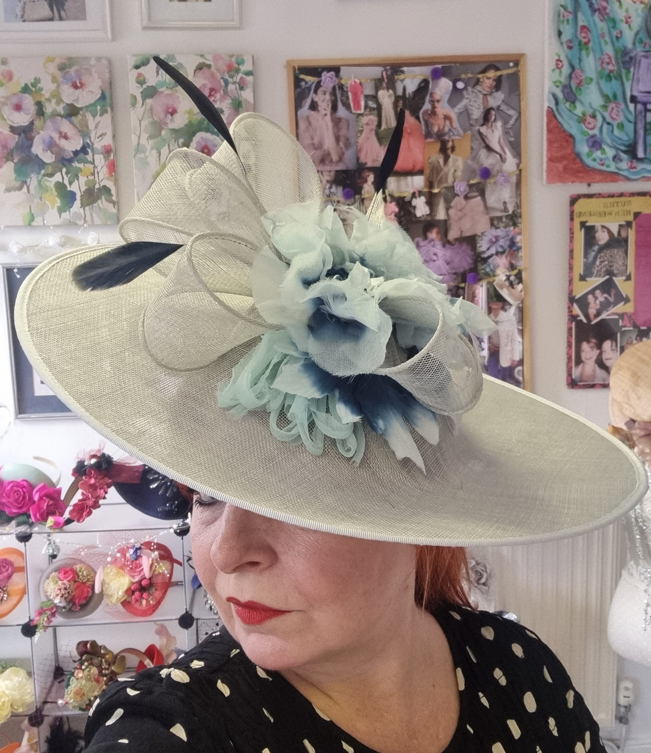 Ice blue aqua Royal flower feather hatinator large dipped sinamay hat fascinator headpiece wedding races womens Very well made.