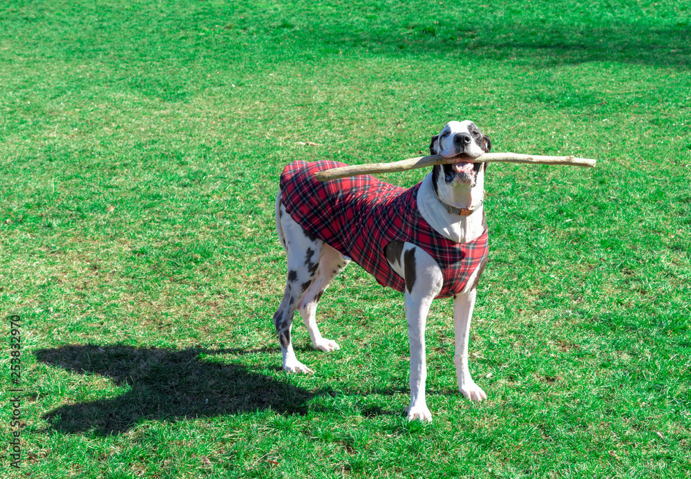 Very happy great dane dog on sunny day wearing plaid pattern sweater while holding a large stick in mouth. Stock Photo Adobe Stock Very well made.