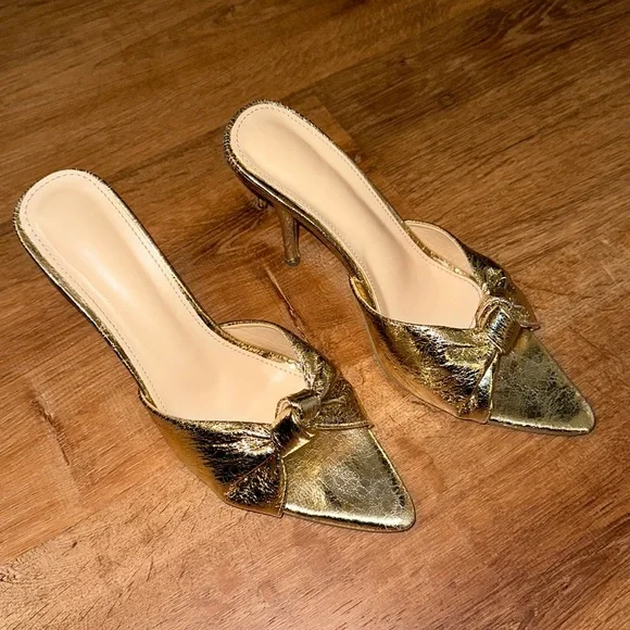 Women s Gold PU Patent Pointed Toe Square Mid Heeled Mules Size 6 Very well made.