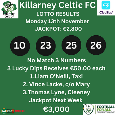 Killarney Celtic FC Lotto Results Monday 14th November Very well made.