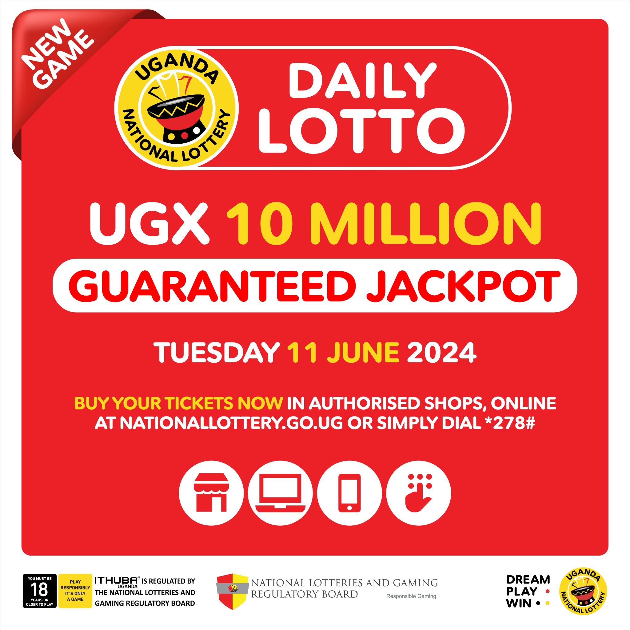 Uganda National Lottery on X Play DAILY LOTTO today for a chance to win a GUARANTEED UGX 10 million jackpot. Get your tickets at authorized shops dial 278 or play online here Very well made.